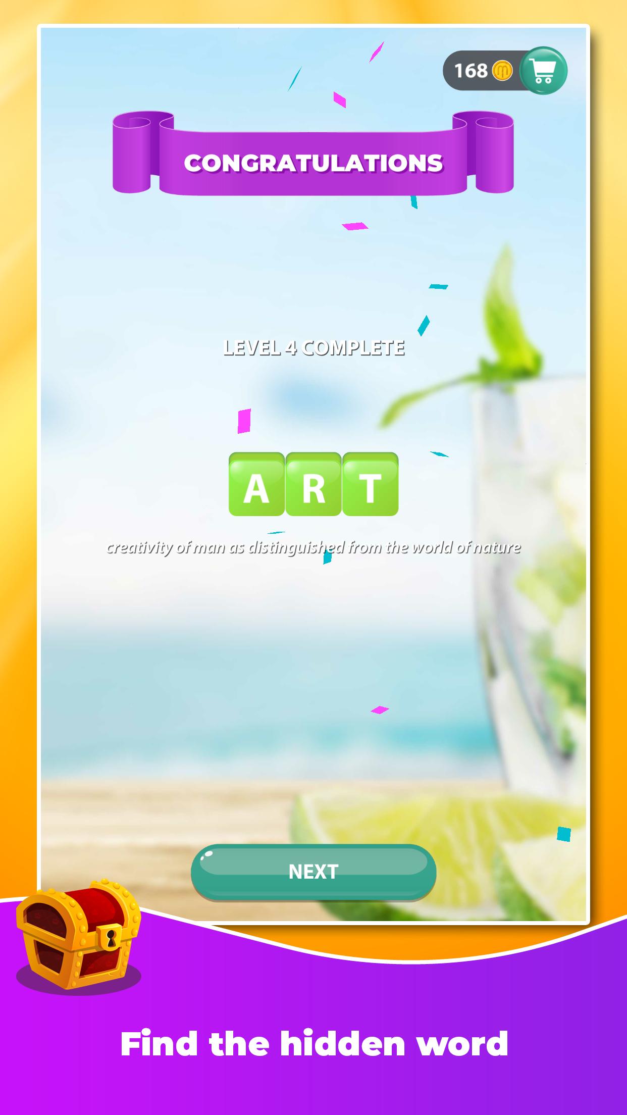 Uma palavra está escondida e você pode revelar pistas encontrando palavras alternativas de letras embaralhadas.